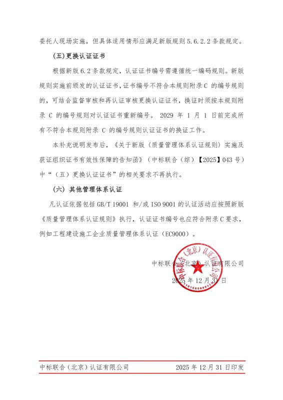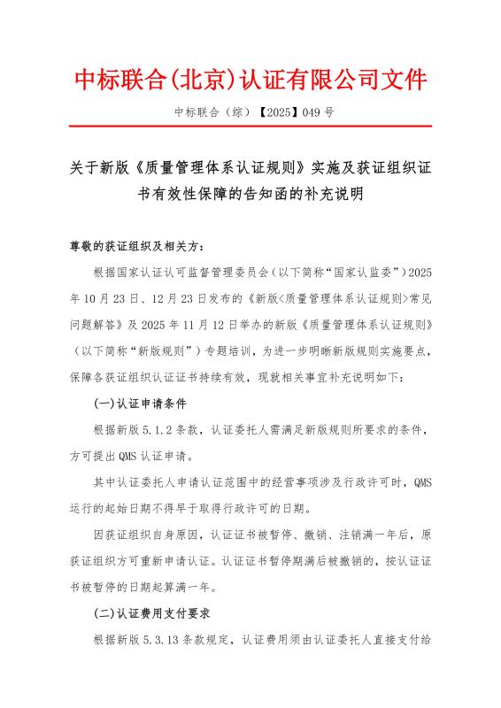 关于新版《质量管理体系认证规则》实施及获证组织证书有效性保障的告知函的补充说明