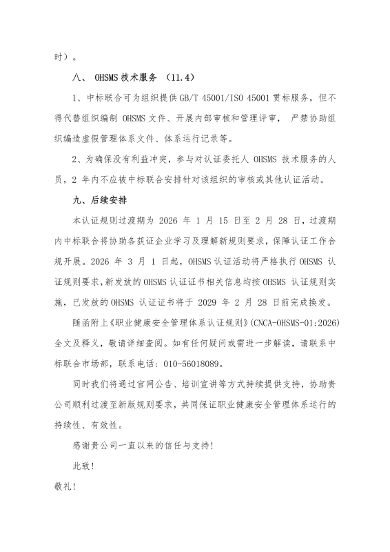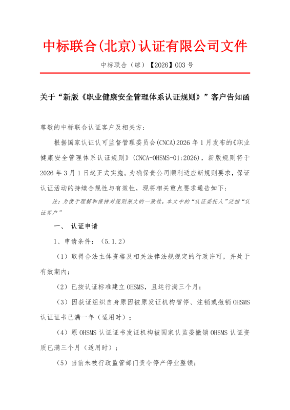 关于“新版《职业健康安全管理体系认证规则》”客户告知函