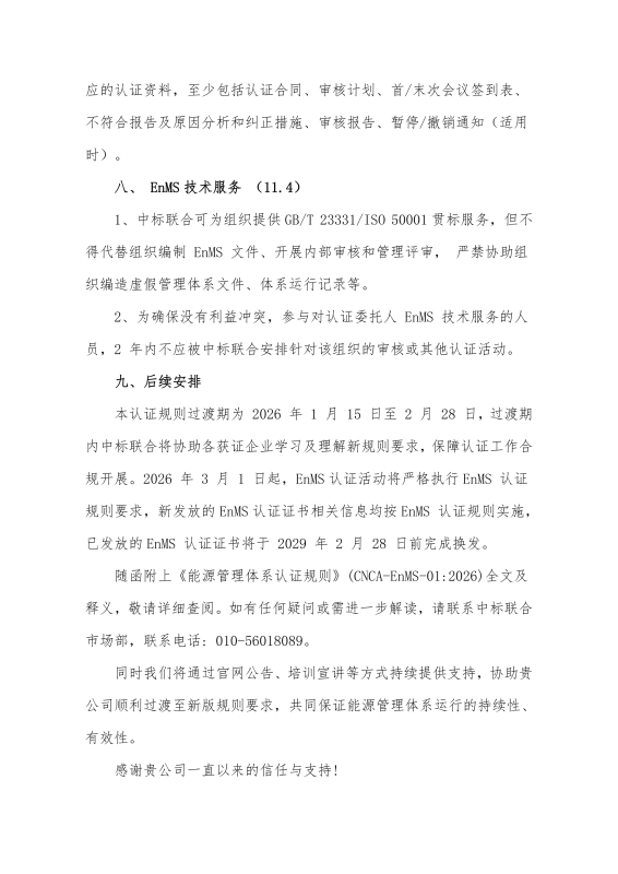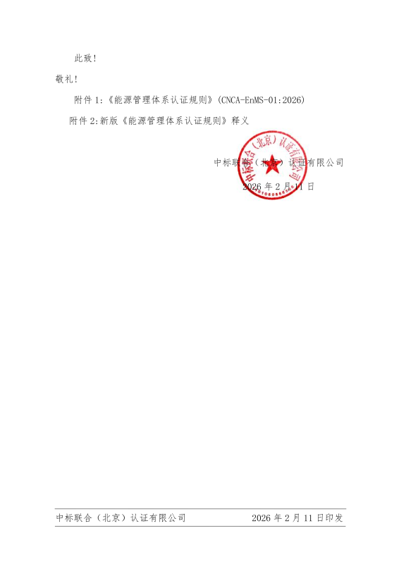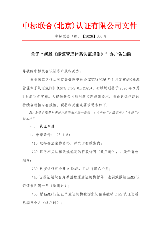 关于“新版《能源管理体系认证规则》”客户告知函
